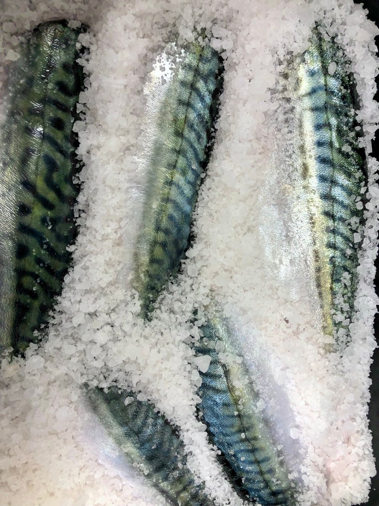 Fileter makrellene og skjær bort bein om du ikke vil renske etterpå. Legg filetene lagvis med grovt havsalt i 1-2 timer. Før du skyller av saltet og skjærer filetene i porsjonsstykker. Trekk bitene i vann i ca 15min(se det ann etter størrelsen på stykkene)
